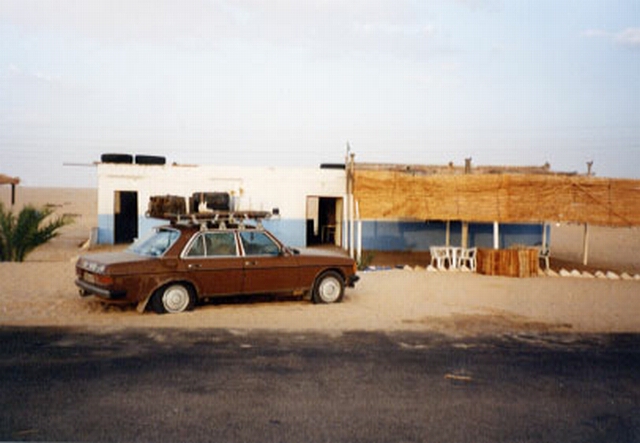 Als der Film vorbei und das Auto ausgebuddelt waren, fuhren wir weiter. Die Sonne war bereits untergegangen und wir mußten uns einen Nachtplatz bei Dunkelheit suchen. Einige Libyer, die mit zwei Peugeots am Straßenrand standen, fragten nach Wasser für den Kühler. Ruckzuck war der eben aufgefüllte 20 Liter Brauchwasserkanister leer. Sie sagten uns, die Straße sei "Ali Baba" und es wäre nicht gut, sie bei Dunkelheit zu befahren, meinten aber, daß sie nur französische Autos hätten, wir aber ein deutsches, mit dem man sicher besser vorankäme.