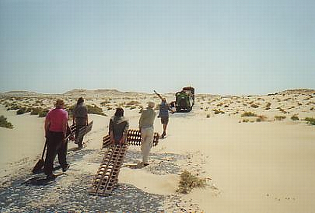 Wir waren schon bald wieder an der Abzweigung, an der wir uns aus Versehen links gehalten hatten und bogen wieder links auf die Straße ab, die an einer leicht dunklen Färbung, wohl Öl, Reifenabrieb und Asphaltreste, zu erkennen war. Wir mußten die anderen einholen. Es wurde immer sandiger. An einer Stelle grub sich der VW-Bus sauber ein. Wir hielten davor und schoben ihn an. "Hilft nichts", stellte ich fest, "rührt sich keinen Millimeter. Bleche in Stellung bringen!" Doch der Schweizer hatte diese seltenen und sehr guten aber auch sehr teuren Luftlandebleche aus oder mit Alulegierung dabei. Wir zogen es vor, diese zu benutzen. Warum sagt der nicht gleich, daß er sowas dabeihat?