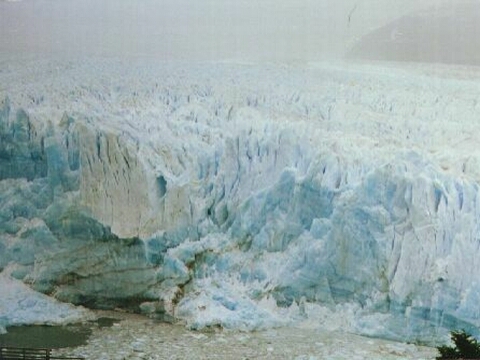 Wir fuhren weiter nach El Calafate, erledigten dort einige Dinge und danach ging es weiter zum Perito Moreno. Beim Abzweig war wieder Piste angesagt. Auf dem Weg dorthin konnte man ihn ab und zu schon durch den Wald sehen. Mächtig und ruhig lag er am Ende eines Sees. Wir erreichten die Plattform. Das Wetter war schon den ganzen Tag verhangen und das Tröpfeln wechselte sich regelmäßig mit dem Regen ab. Wir trennten uns zwischen diejenigen, die Laufen konnten und diejenigen, die humpelten. Ich lief auf und ab und machte Bilder. Ab und zu kalbte der Gletscher und das Getöse, wenn ein paar Tonnen Eis ins Wasser klatschen ist kilometerweit zu hören. Es war auch ein Schild da, welches stolz verkündete, daß in den letzten 10 oder 15 Jahren mehrere Touristen von umherfliegenden Eissplittern erschlagen worden sind. Unter Eissplitter darf man sich nicht die Splitter vorstellen, die man sich abends in den Longdrink mixt, sondern es handelt sich um Teile, die halb so groß sind, wie ein ausgewachsener Stier. Nette Aussichten. Ich wollte so einen stürzenden Eisberg photographieren, leider gelang mir dies nicht, weil gerade keiner da zu stürzen bereit war, wo ich mit der Kamera hinzielte.