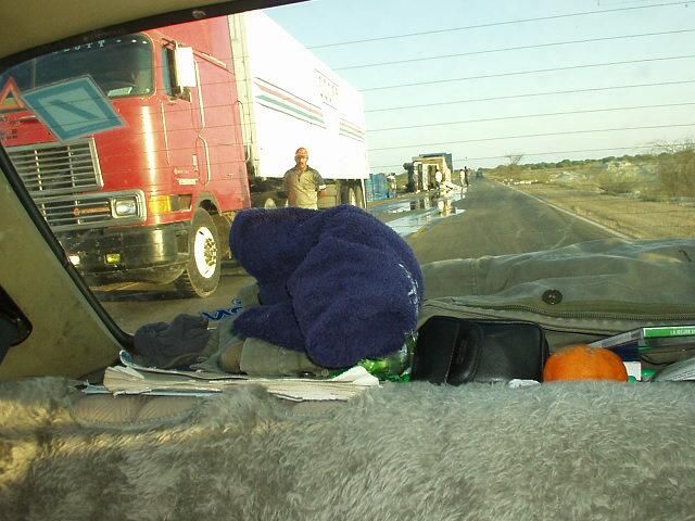 Auf dieser eben leider nicht endlosen, schnurgeraden Strecke fahren - anders als in der Sahara - ziemlich viele Autos. Es ist nicht so, daß man etwas Außergewöhnliches schon kilometerweit im Voraus sieht. Daher waren wir schon ziemlich nahe rangekommen, als wir feststellten, daß da vorne etwas passiert sein mußte. Ein kleiner Mercedeslaster lag auf der Seite und irgendeine übelriechende Flüssigkeit lief gemütlich die Straße entlang. Es war ein Fischlaster. Das muß man auch erst mal schaffen, einen Laster auf gerader Strecke dermaßen blöd auf die Seite zu legen.