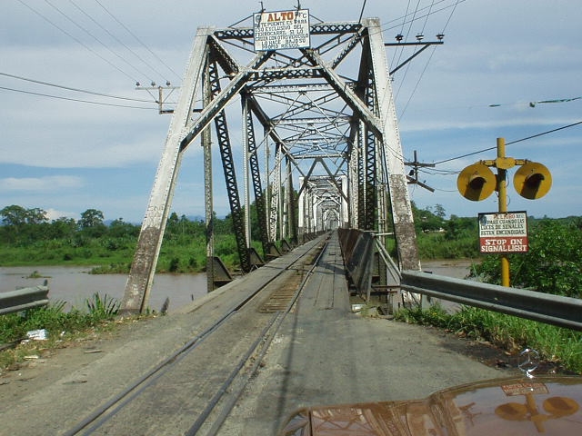 Wir näherten uns dem Grenzgebiet. Es handelte sich um den Grenzübergang Limón. Wenn man sich diese Region auf der Karte besieht, stellt man fest, daß es keine Straße gibt, die über die Grenze führt. Auf costaricanischer Seite gibt es wenig Straßen, dafür umso mehr Schienen. Und es waren auch nur Schienen, die über die Grenze führten. Irgendwann hörte die Straße auf und mündete an einer Eisenbahnbrücke. Nur über die ging es weiter. Ganz oben war ein Schild angebracht, auf dem geschrieben stand: "ALTO! ESTE PUENTE ES PARA USO EXCLUSIVO DEL FERROCARRIL, SI LO CRUZA EN OTRO VEHICULO LO HACE BAJO SU PROPIO RIESGO". Das bedeutet auf Deutsch: "Halt! Diese Brücke ist für die ausschließliche Nutzung durch die Eisenbahn, wird sie mit einem anderen Fahrzeug überquert, so geschieht das auf eigene Gefahr."