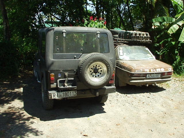 Erst die Isomatte direkt auf die Bleche. Darüber die beiden Decken, sorgsam gefaltet. Auf den Schlafsack konnte man getrost verzichten. Zu warm, zu schwül. Die Spaten kamen an die beiden Enden des Gepäckträgers, mit Expander befestigt, mit dem Stiel nach oben gerichtet. Dann wurde das ganze Ensemble mit dem Moskitonetz eingewickelt, ich stieg über Agrarhaken und Kofferraum aufs Dach hinauf, steckte das Messer griffbereit zwischen zwei Kanister, einen Stiefel als Moskitonetzhalter auf einen Dieselkanister, den anderen zum selben Zwecke in das Ersatzrad. Nun konnte man Mückenfrei schlafen. Was für ein Tag...
