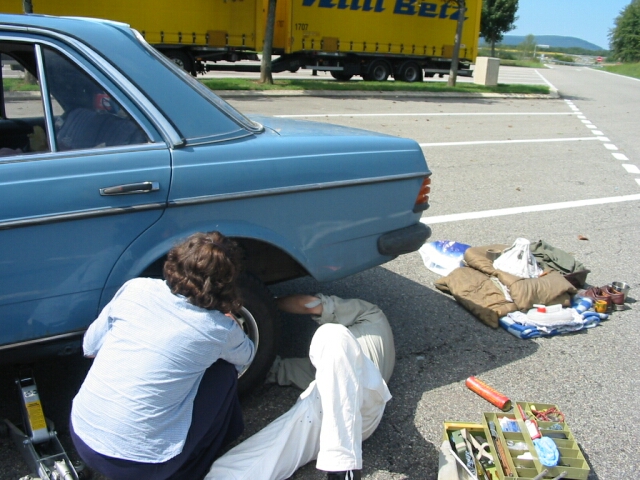 In der Früh hatte ich es mir wieder anders überlegt. Nun war die Welle abgekühlt. Sie macht erst Geräusche, wenn sie heißläuft, also konnten wir erst mal einige Kilometer fahren. Als sie sich gegen 14:15 Uhr wieder meldete, fuhren wir auf eine Raststätte und kümmerten uns darum. Fetten, dann mit Panzertape umwickeln. Wir hatten zwar einen Schlauch, den ich damals in Brasilien mitgenommen hatte, aber der lag in der Ersatzteilkiste in L.A. und half uns nur sehr wenig. Es ist idiotisch, ohne einen solchen Schlauch loszufahren, aber darüber macht man sich natürlich erst Gedanken, wenn man irgendwo steht und die Gelenkwelle extrem bedenklich klingt. Solange alles in Ordnung ist denk man sich nur, es würde schon schiefgehen...