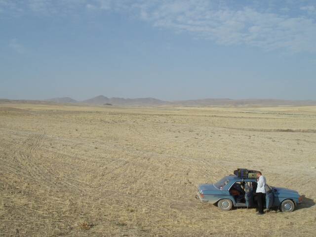 Wir fuhren durch einige Käffer, hielten ab und zu an, um den Kühlschrank zu nässen, oder um zu tanken. Vor allen Tankstellen, die Diesel verkaufen stehen LKW an, oft hunderte von Metern. Bisher wurden wir immer nach vorne geholt, weil der Tankwart meint, wir wollten Benzin. Natürlich fuhr ich dann immer genau vor die Dieselzapfsäule und begann zu Tanken. Alles, was dabei passiert, ist, daß der Tankwart drei oder viermal sagt, daß es sich um Diesel handelt, hier "Gasoil" genannt. Und nachdem man dreimal das Wort wiederholt, auch wenn er zwischendrin mal "Benzin" sagt, läßt er einen in Ruhe. Eine Parallele zu Brasilien. Dort kennen sie auch keine Diesel-PKW. Die Landschaft jedenfalls war schön und ließ nicht im entferntesten einen Vergleich zum brasilianischen Einheitsgestrüpp zu. Und immerhin halten die Perser ihre Schilder in Persisch und in Englisch. Meistens zumindest. Innerorts sind englische Schilder manchmal Mangelware, in besonderen Orten sind Schilder überhaupt Mangelware.